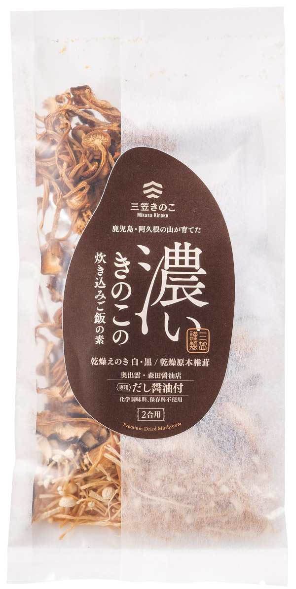 鹿児島・阿久根の山が育てたきのこと奥雲仙・森田醤油店の専用のダシ醤油を使った、化学調味料、保存料不使用の体にも美味しい炊き込みご飯の素です。