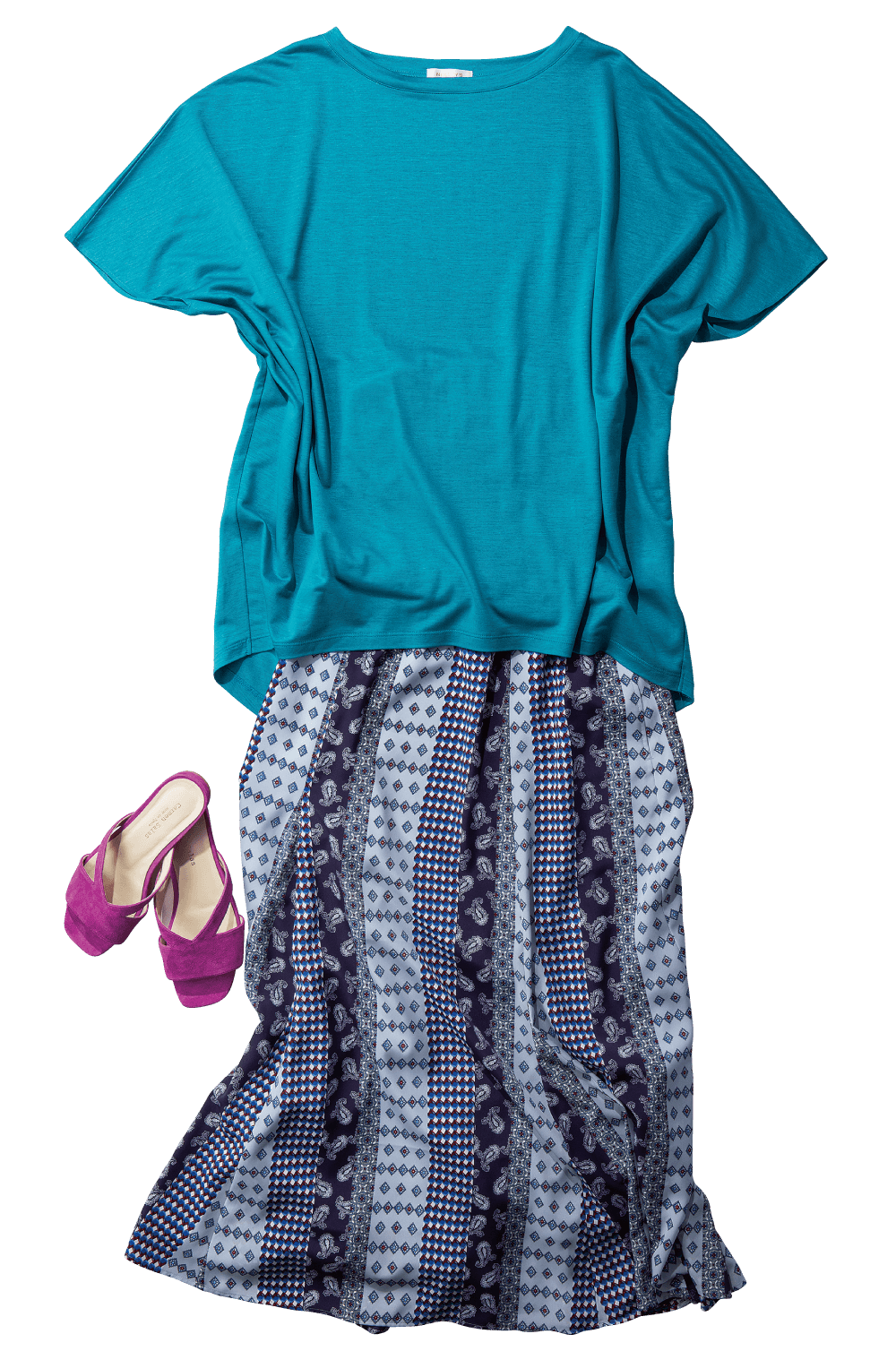 マルチ柄が新鮮なスカートはウエストゴムで履きやすく、トップスもゆったりしたカットソーで動きやすさ抜群。