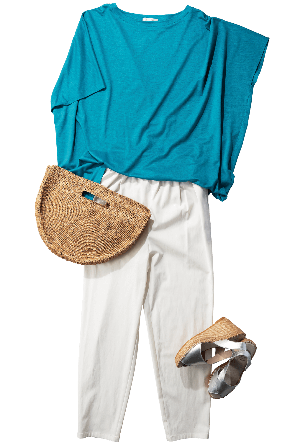 ブルー×白の爽やかコーディネート。ボトムスは白ですが、手洗い可能なので、旅先でも安心。