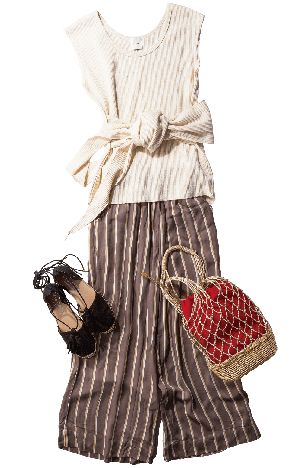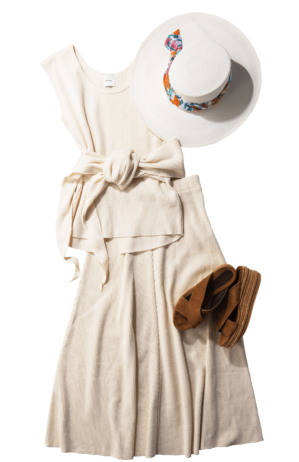 今年トレンドのセットアップスタイルを女性らしく。ストローハットとサンダルで、少し肩の力を抜いた大人の旅スタイル。