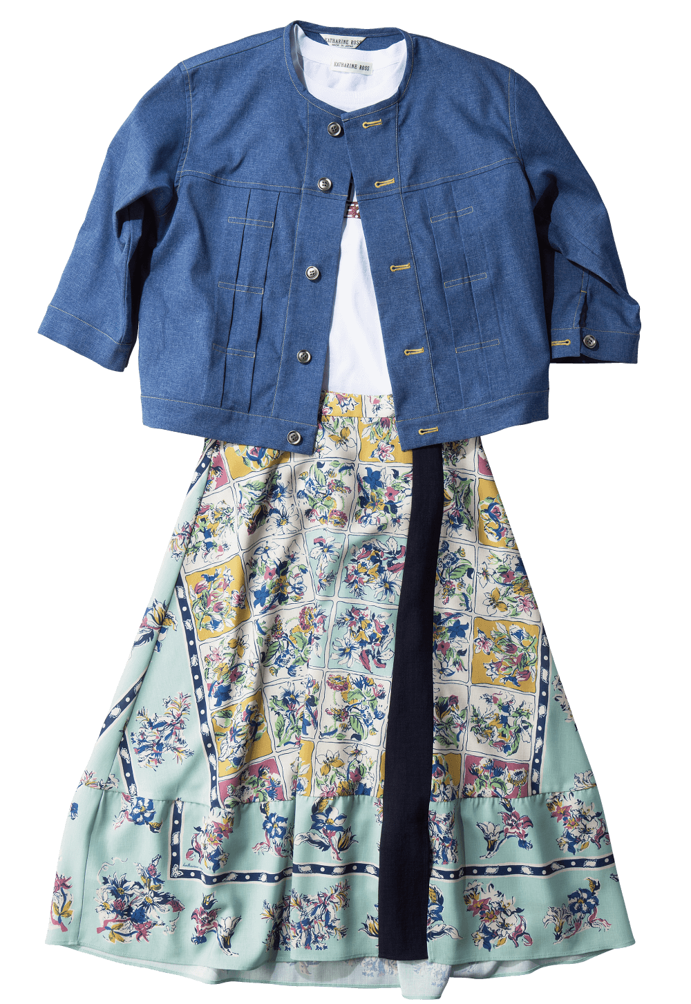 長時間移動の座りじわ、畳みじわが気になりにくい素材のフェミニンなスカートには 撥水加工を施したGジャンを合わせてカジュアルさをプラス。