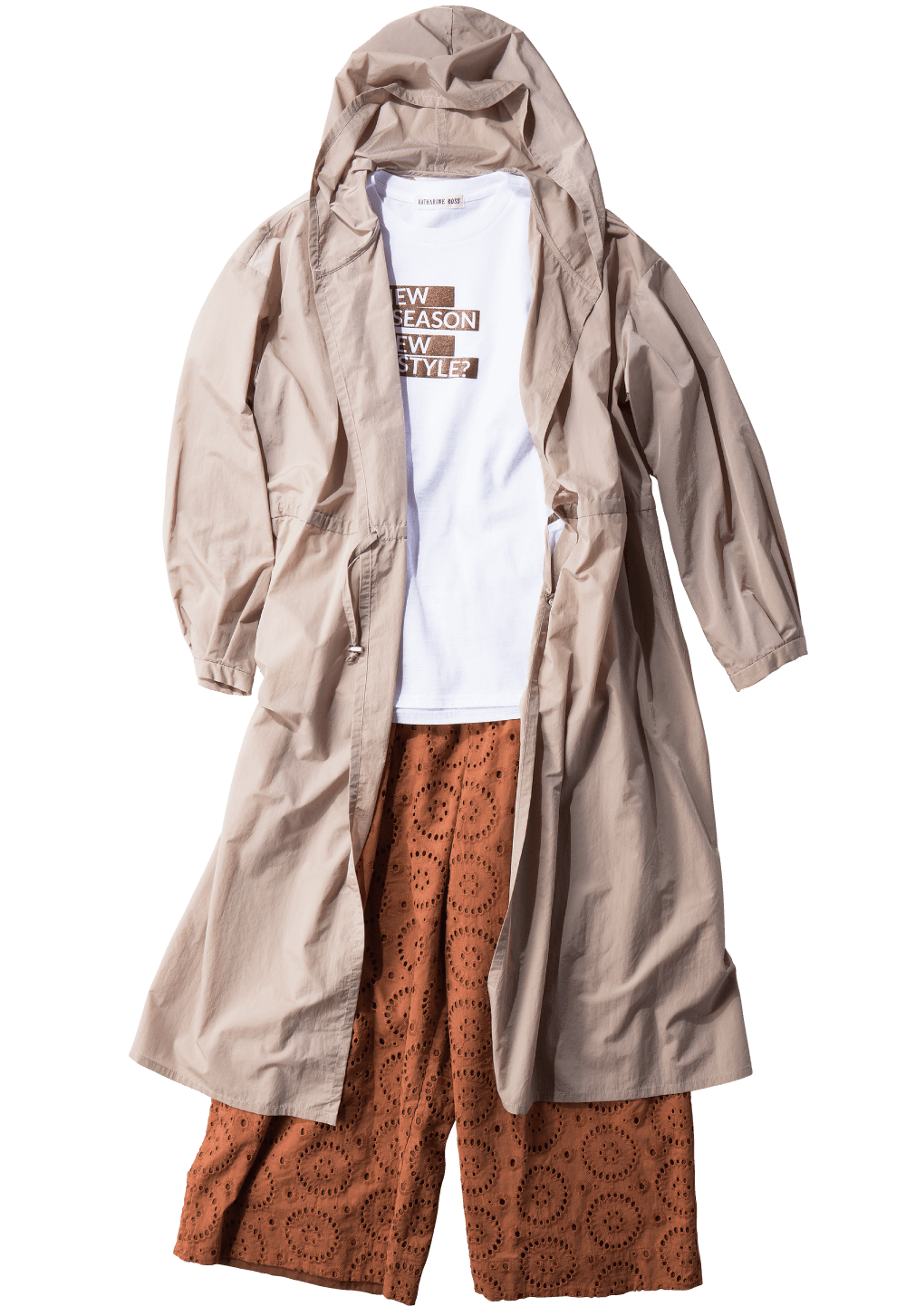 軽やかで涼しく履ける楽チンウエストゴムパンツ。急な天候の変化にも便利な撥水パーカーと合わせてIラインシルエットの細見えコーデ。