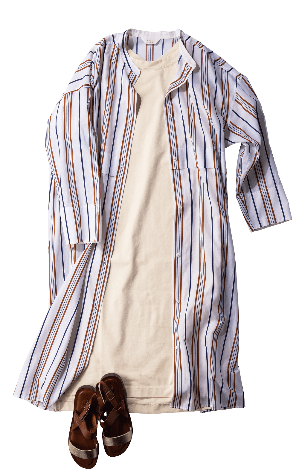 着るだけで、スッキリハンサム細見えコーディネート。ロングシャツドレスの爽やかなストライプが清涼感を演出。